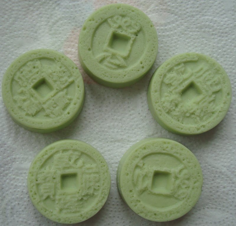 Die Gesamtfettmenge reichte für die MWM-Formen "Chinesischer Drache" und "Chinesische Münzen". Obwohl eine Menge an festen Fetten in der Seife ist, ist sie doch recht weich geblieben. Ich war aber wie üblich sehr ungeduldig und habe die Seifen gestern abend ins Gefrierfach gelegt. Heute morgen wollte ich sie unbedingt aus den Formen würgen. Das war aber keine gute Idee. Die feinen Details sind allesamt in der Form geblieben.